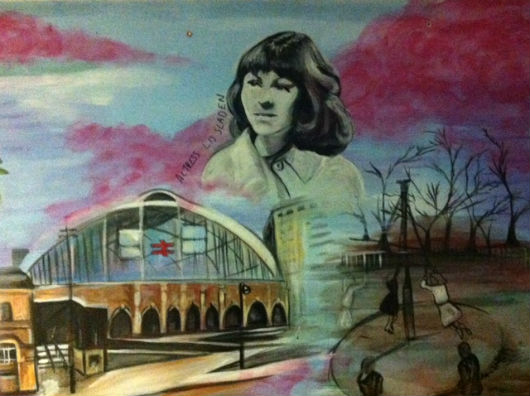 Nicola carried out a number of workshops in the area which involved working alongside local residents groups and Sudley School to gather ideas for the artwork, with Sladen appearing due to her attendance at a local school in Aigburth Vale.