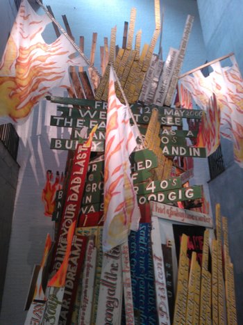 I’m standing by a jumble of wooden posts, and gaudily painted slogans. I’m standing right next to it. And it looks and feels like one of those old house clearance shops you get in Kirkdale - the piled up detritus of a life extinguished. A funeral pyre.