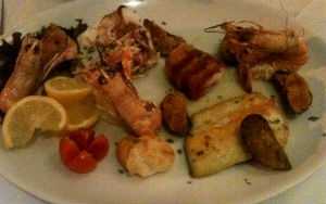 Bellini says it’s all about ingredients, a claim that the selection of fresh fish we’ve ordered at an eyebrow-raising £19.90 should confirm or disprove. It seems that the selection of fish changes from day-to-day, as Bruno isn’t sure which fish are on. In the event there are some mussels with breadcrumbs, a scallop, some enormous langoustines, a cube of monkfish wrapped in pancetta, a generous and meaty bit of calamari and a sublime bit of pan-fried sea bass.
