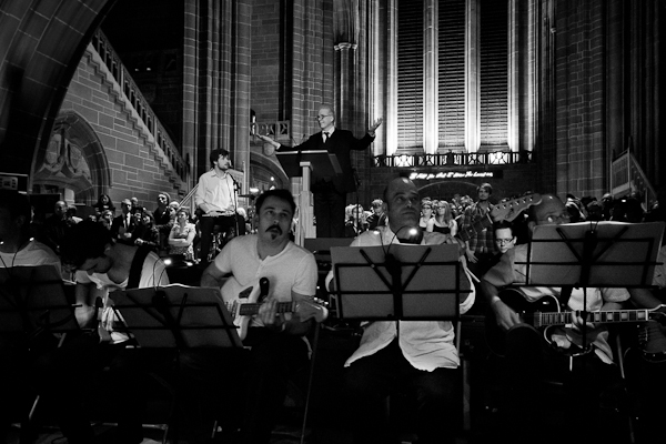 At about 8pm, the cathedral reached its capacity, and ‘A Crimson Grail’ began: slowly and steadily, sections of guitarists, and a smattering of bassists, creating humming, swirling drones that sounded like the Philharmonic Orchestra on a double dose of Xanax. Rising and falling, and with snatches of dissonance, the piece started to become meditative: reaching high up in the cathedral’s massive ceilings and bouncing back down again.